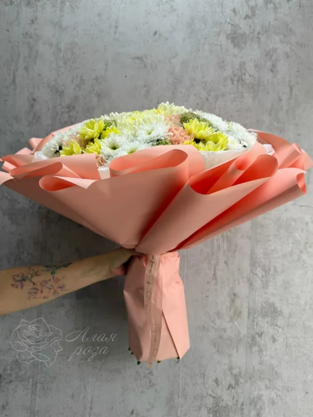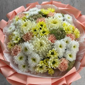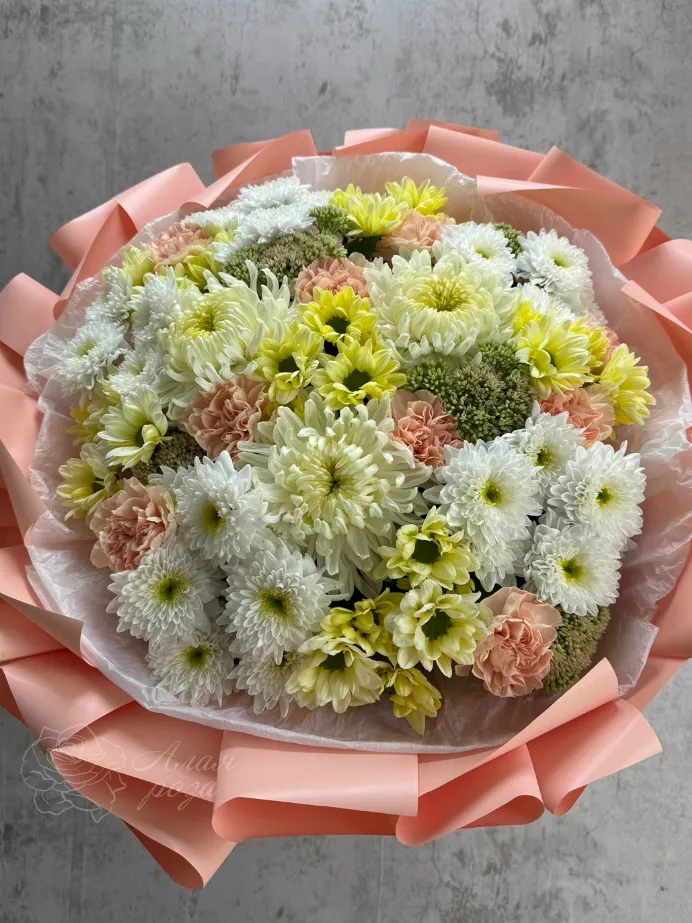 Круглый букет из хризантем и диантусов